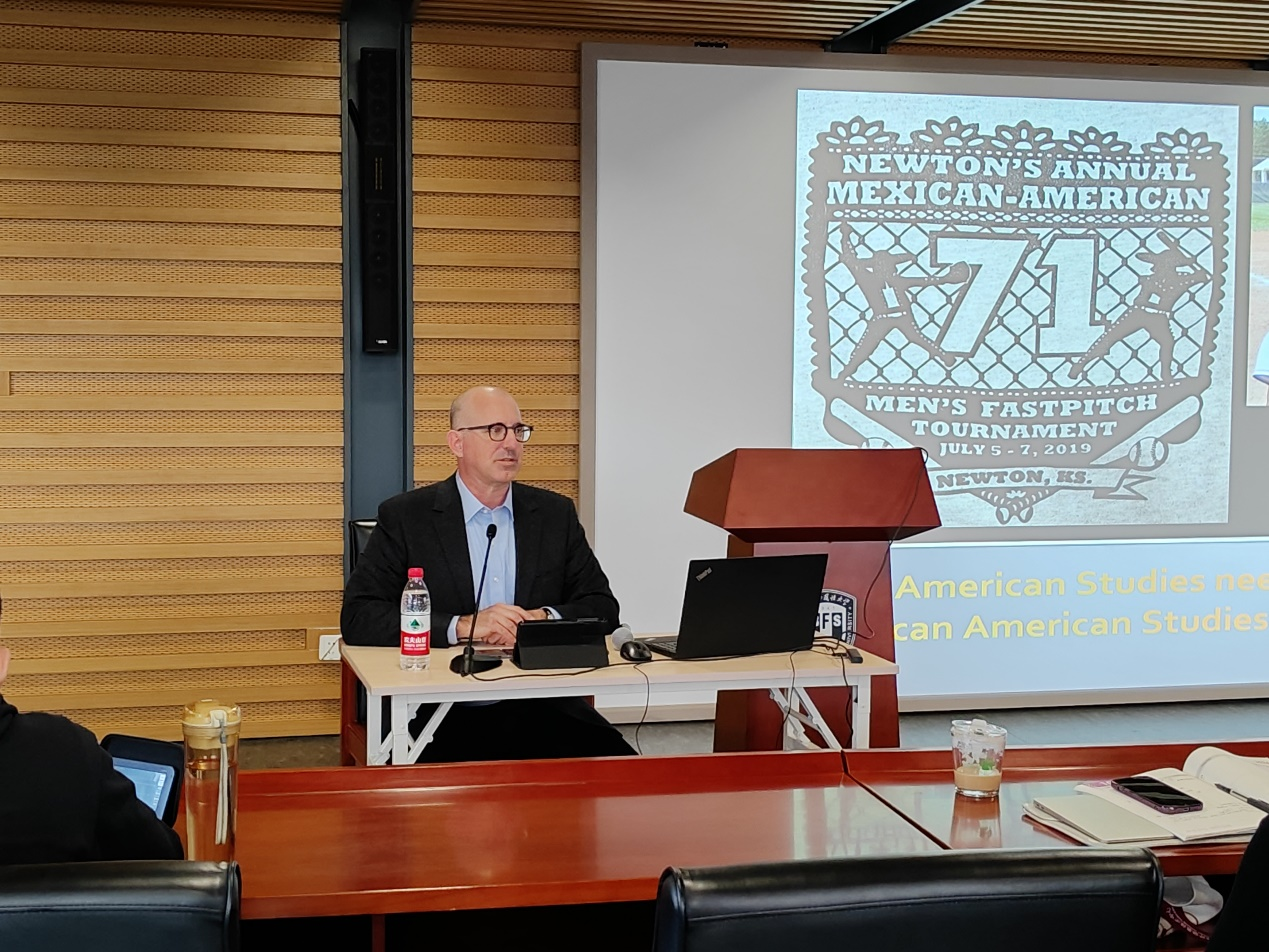 在中美“旧金山愿景”实施一周年即将到来之际,为加强中美人文交流,促进美国文化研究走向深入,10月25日,pp电子游戏平台官网特邀美国堪萨斯大学美国学系主任、美国著名墨西哥裔民族志专家本·查佩尔(Ben Chappell)教授莅临“专英讲堂”,为全校师生做了题为“美国研究中的墨西哥裔美国人研究”的学术讲座。来自pp电子游戏平台官网、英语学院、国际关系学院等兄弟院系师生近60人参加讲座。讲座由pp电子游戏平台官网副院长仵胜奇主持。