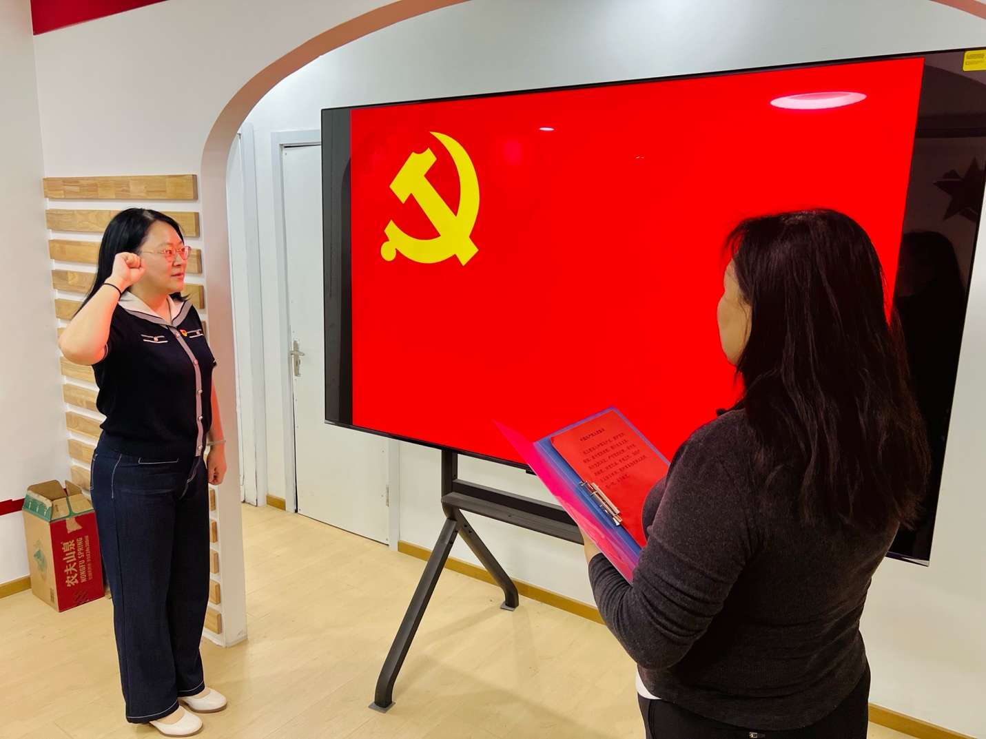 在红色书屋,党支部举行了预备党员宣誓仪式。教师党支部书记廖鸿婧宣读了任杨老师的发展决定。在鲜红的党旗下,任杨老师庄重宣誓,郑重承诺将以实际行动践行党的宗旨,忠诚于党、忠诚于人民,为共产主义事业奋斗终身。