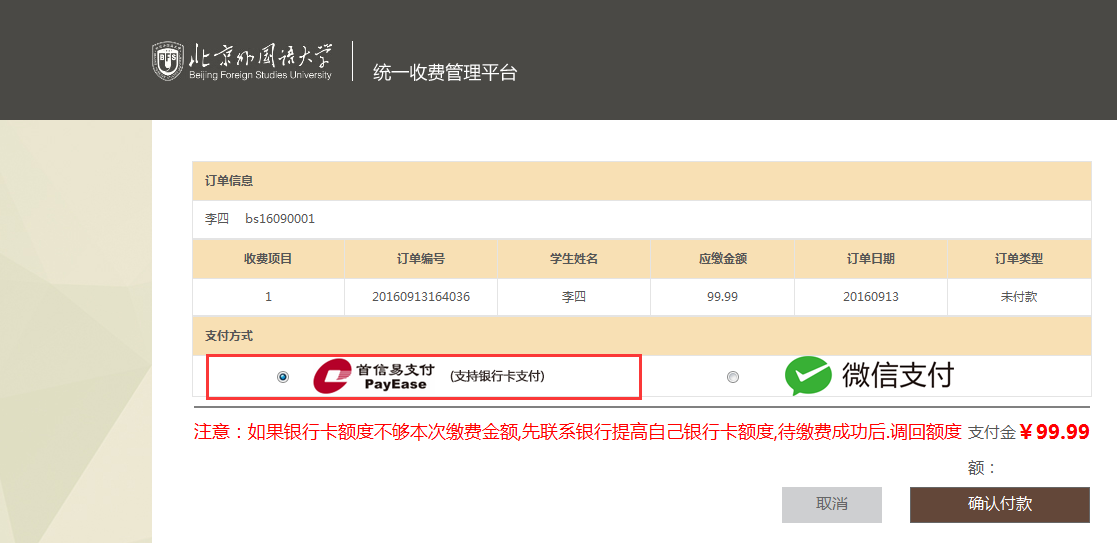 选择支付方式:首信易支付、微信支付等,然后点击【确认支付】;