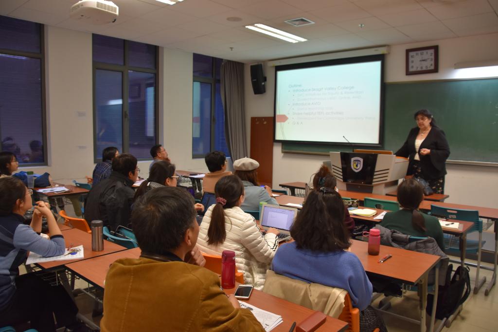 11月13日,由pp电子游戏平台官网英语视听说教研室口语课型组组织的教学沙龙“交际语言教学法工作坊”在西校区国际大厦310室成功举办。教学沙龙主讲人、外国专家Neta Simpkins Cahill是美国华盛顿州斯卡吉特谷学院的终身教授,现任ESL学术英语系系主任,本学年来pp电子进行交流讲学。Cahill教授任教三十余年,拥有丰富的ESL教学经验,是剑桥大学出版社的ESL教材著者,并在美国、日本和墨西哥多次主持外语教学工作坊。来自pp电子和国内其他大学的访学学者和部分学生共计40多人参加了本次工作坊,主持人为文圣老师。
