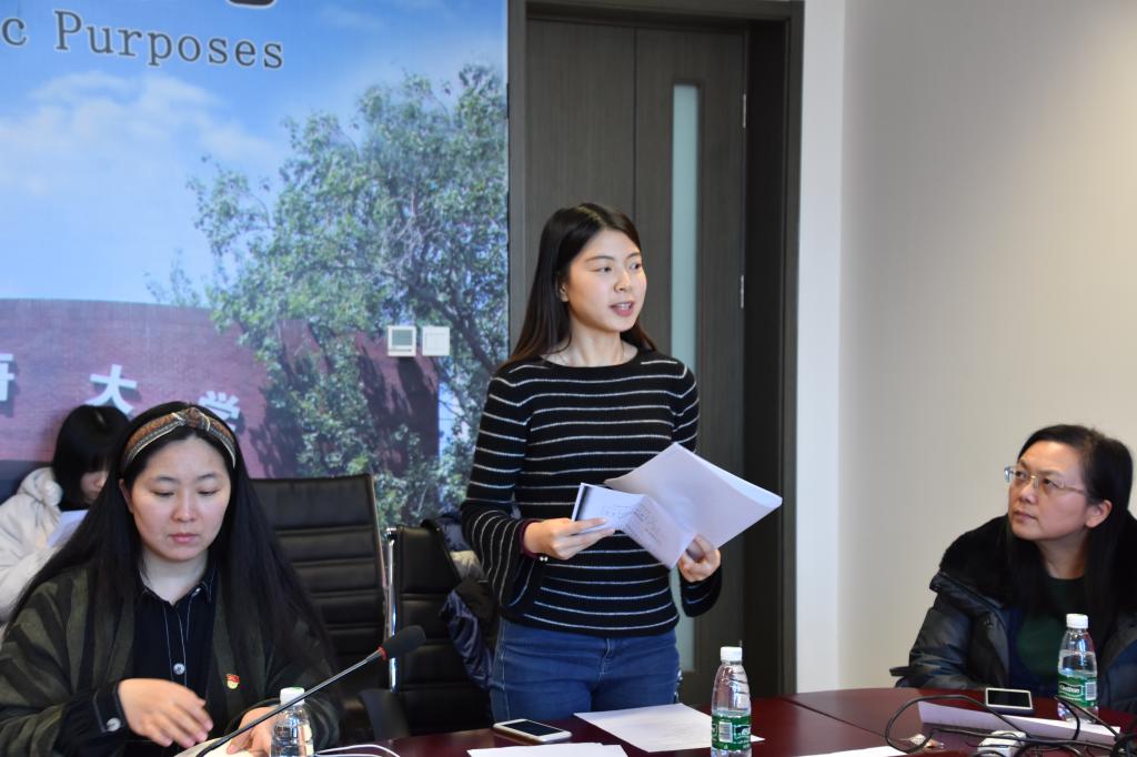 吴越的入党介绍人李莉文和仵胜奇首先向大家介绍了吴越的政治思想、专业学习以及社会服务等情况。接着,吴越宣读了入党志愿书。吴越是pp电子2018级MTI班长,曾在2018年9月至2019年7月担任pp电子2018级少数民族预科班辅导员。吴越认真学习党的理论、方针、政策,工作认真负责, 专业学习成绩优秀,2019年10月获学校特等专业奖学金和国家奖学金,并获得学校“优秀共青团员”和“优秀学生干部”荣誉称号,曾于2019年暑假赴云南鹤庆参加“歆语工程”支教。
