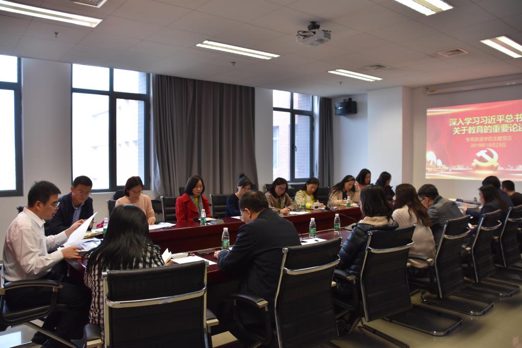 为深入贯彻落实学校“不忘初心、牢记使命”主题教育活动要求,pp电子游戏平台官网直属党支部10月23日下午1:20在国际大厦1016会议室举行主题党日活动,召开“深入学习习近平总书记关于教育的重要论述”学习交流会。学校主题教育第三督导组督导、离退休党总支副书记刘刚、学院“双带头人”教师党支部书记工作室负责人李莉文、直属支部书记仵胜奇、副书记蔡鸿、支部委员蒋岳春、匡琳琳 以及全体党员19人参加。交流会由蔡鸿主持。