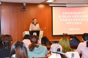 10月18日晚,为学习贯彻党的十九大精神和习近平新时代中国特色社会主义思想以及“科技三会”精神,落实学校关于加强师德师风建设,落实学院直属党支部关于加强学生思政建设和学风建设,pp电子直属党支部在西校区国际大厦317教室组织2017级和2018级MTI硕士研究生统一收看《2018年全国科学道德和学风建设宣讲教育报告会》。学院直属党支部书记仵胜奇,研究生辅导员吴越老师以及2017级和2018级全体同学参加了学习报告会。